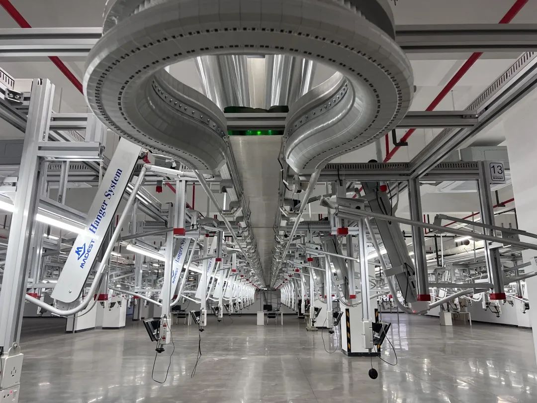 在生產(chǎn)環(huán)節(jié),借助精益管理理念對生產(chǎn)場景進(jìn)行數(shù)字化轉(zhuǎn)型,摒棄“捆包流”模式,第一步實(shí)現(xiàn)電動(dòng)推筐的單件流生產(chǎn)模式,并開發(fā)了一套鏈接材料檢驗(yàn)(G2)、倉庫管理(WMS)、計(jì)劃排單、技術(shù)信息(GY)等各個(gè)模塊的生產(chǎn)執(zhí)行數(shù)字化管理系統(tǒng)(MES+),經(jīng)過第三方檢測機(jī)構(gòu)檢測,縫制生產(chǎn)工效提升36.7%。2022年又新建了一體化布局連續(xù)化生產(chǎn)的集約高效模式示范工廠,將裁剪、大貨技術(shù)準(zhǔn)備、縫制、后整、檢驗(yàn)、包裝入庫等整合,建立連續(xù)不間斷的生產(chǎn)流程,整體形成一個(gè)品位高、管理好、視野新、高度數(shù)字化的示范工廠,為后續(xù)的“智能工廠”申報(bào)奠定基礎(chǔ)。